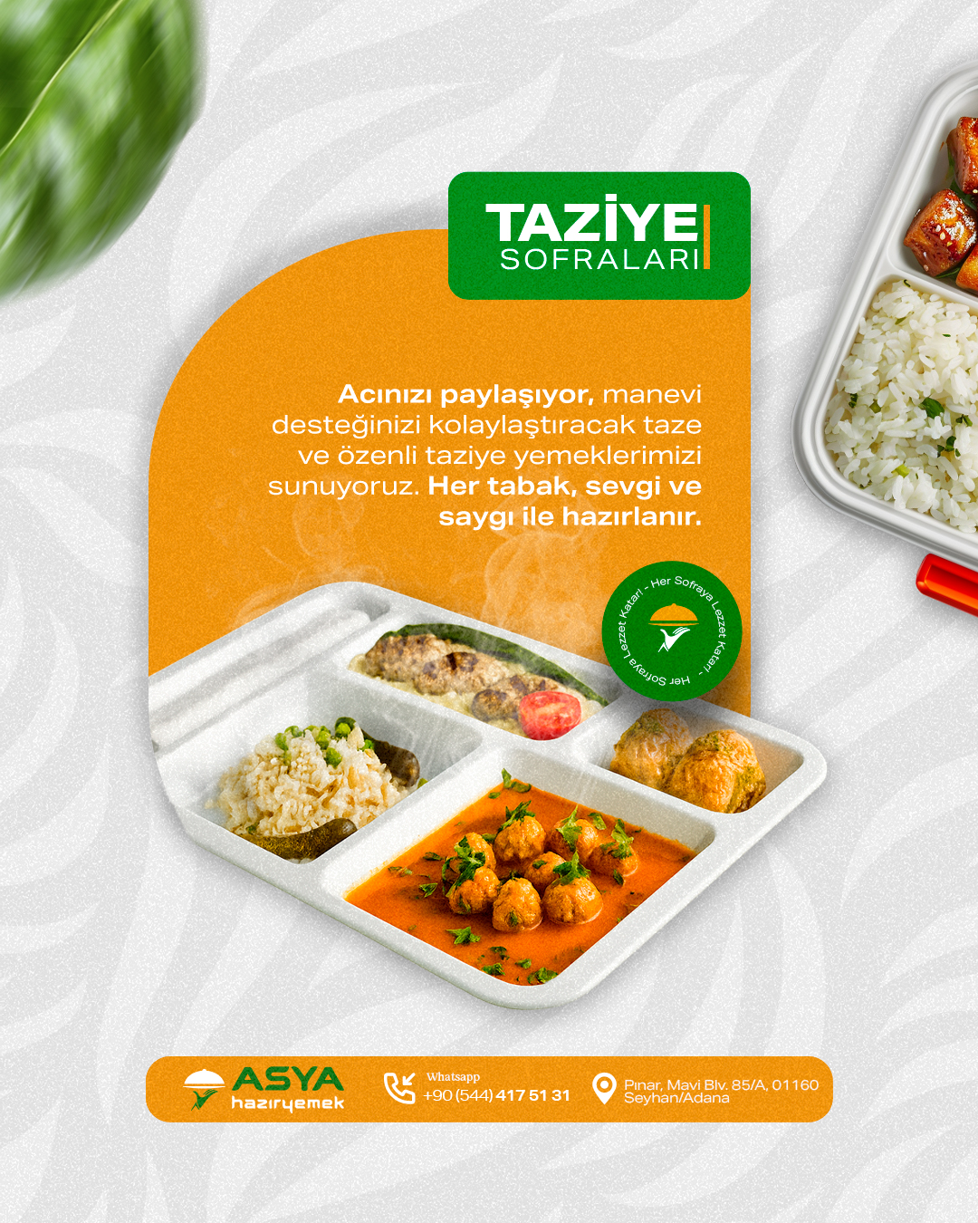 Taziye sofralarında önemli olan, hem misafirlerin hem de ailenin manevi huzurunu korumaktır. Asya Hazır Yemek, acınızı paylaşır, yükünüzü hafifletir ve bu zor günlerde size destek olur. Her tabak, saygı ve sevgiyle hazırlanır; çünkü bizim için her sofrada bir anlam, her yemekte bir emek vardır.